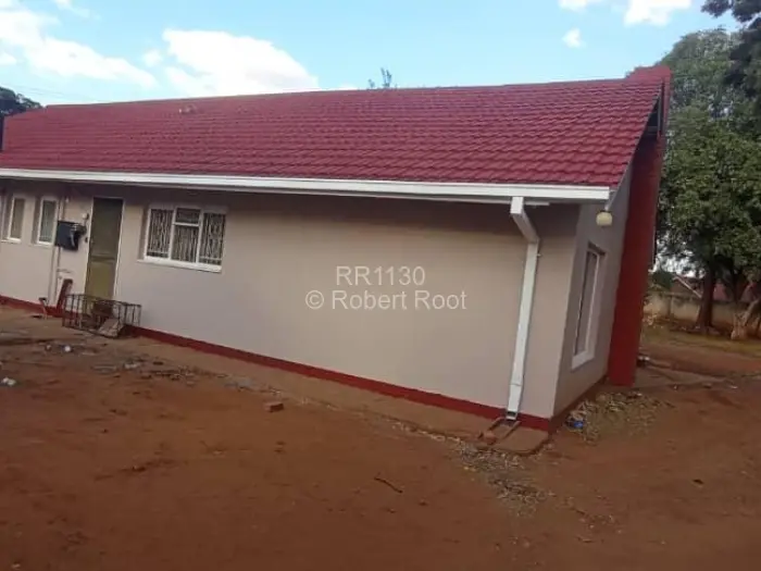 Solar panels on the side enhance energy efficiency, while numerous windows invite natural light into the home, creating a bright, airy feel inside. The outdoor area features a somewhat uneven concrete surface, perfect for relaxing and enjoying the beautiful Zimbabwean weather.