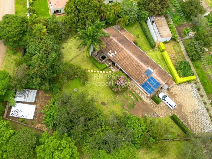 Charming family home in Vainona, Harare North spacious, private and ready to enjoy. Set on a generous 2,090 m erf with a 500 m building footprint, this single-storey residence offers three comfortable bedrooms and two bathrooms, ample living space and excellent indoor/outdoor flow. As shown in the photos, the property benefits from reliable water with a borehole and visible holding tanks, plus solar panels on the roof to reduce electricity costs. Interiors include a large, well-equipped kitchen with plenty of cupboards and cooking space, a bright open-plan lounge/dining area with a character fireplace, and room for a home office or gym. The main bathroom features a full bath and separate shower, while bedrooms are generous with built-in storage. Outside youll find a lush, private garden with mature palms and lawns, a covered veranda/gazebo perfect for entertaining, a paved driveway with secure parking and a separate outbuilding that can serve as staff quarters, workshop or additional storage. Aerial photos clearly show the established, fenced plot and excellent neighbourhood setting. Ideal for family living or renovation into a bespoke entertainers home contact us today to arrange a viewing.
