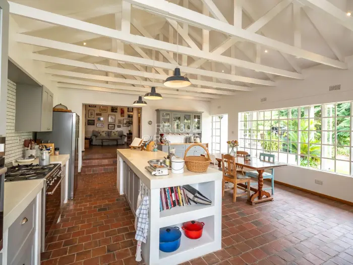 The main residence features five bedrooms, one-and-a-half bathrooms and two generous lounges, creating comfortable spaces for both family living and entertaining. The open-plan kitchen and dining area, complemented by a scullery and pantry, forms the heart of the home, with fireplaces in both the kitchen and lounge adding warmth and character.