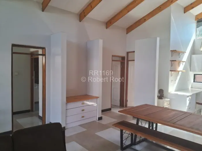 Ceiling and Structure: The room features a vaulted or cathedral ceiling painted white. Striking exposed wooden beams run across the ceiling, giving the space a warm, rustic, and contemporary look. The beams contrast sharply with the white ceiling and walls.